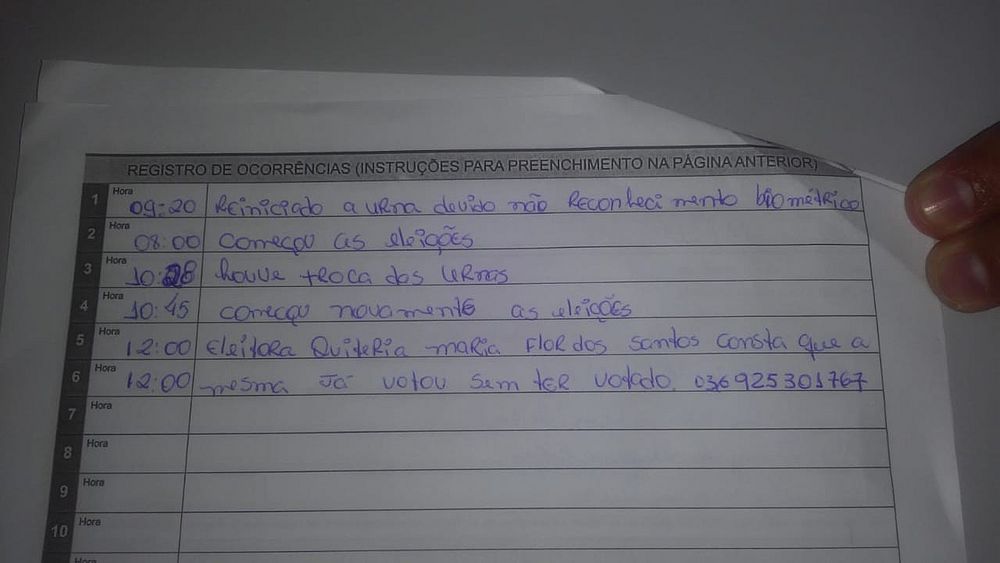 Uma imagem do relatório de ocorrências da seção de Maria Quitéria mostra que antes do início da votação, a urna da seção de Quitéria foi reiniciada por não reconhecer biometria e, uma hora e meia antes de Quitéria entrar na seção, ela foi trocada. Confira abaixo: