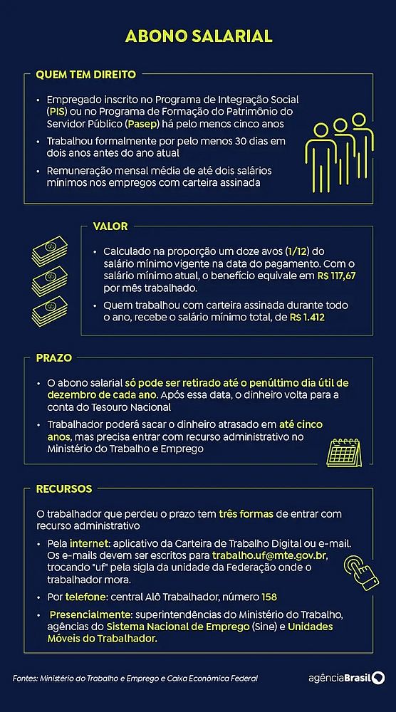 Tem direito ao benefício o trabalhador inscrito no PIS/Pasep há, pelo menos, cinco anos, e que tenha trabalhado formalmente por, no mínimo, 30 dias no ano-base considerado para a apuração, com remuneração mensal média de até dois salários mínimos. Também é necessário que os dados tenham sido informados corretamente pelo empregador na Relação Anual de Informações Sociais (Rais).