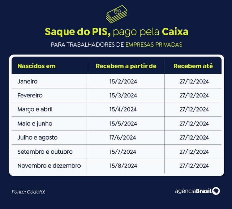 O PIS é pago pela Caixa Econômica Federal; e o Pasep, pelo Banco do Brasil. Como ocorre tradicionalmente, os pagamentos serão divididos em seis lotes, baseados no mês de nascimento, no caso do PIS, e no número final de inscrição, no caso do Pasep. Os saques começam nas datas de liberação dos lotes e acabam em 27 de dezembro de 2024. Após esse prazo, será necessário aguardar convocação especial do Ministério do Trabalho e Previdência.