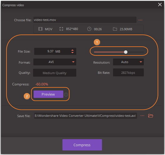 Na segunda seção, você pode ver várias configurações de compactação listadas aqui. Mova a barra de progresso para comprimir o tamanho do vídeo rapidamente. Clique no botão “Visualizar” para visualizar a qualidade do vídeo compactado por 20 segundos.