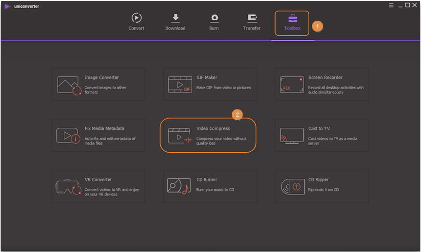 Depois comece por iniciar o aplicativo. Após a instalação, clique na guia Toolbox e escolha a opção Video Compress .