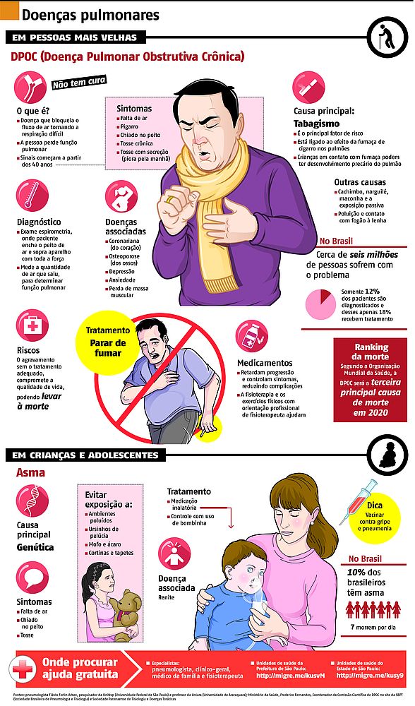 Ao contrário da DPOC, a asma, também uma doença pulmonar, tem causas genéticas e, normalmente, atinge mais as crianças e os adolescentes. "Idosos também podem ter, mas é mais comum se manifestar em idades mais iniciais", afirma o pneumologista Flávio Ferlin Arbex. "É preciso controlar a doença usando aquelas bombinhas com medicação inalatória. É uma doença que não tem cura." (TC)