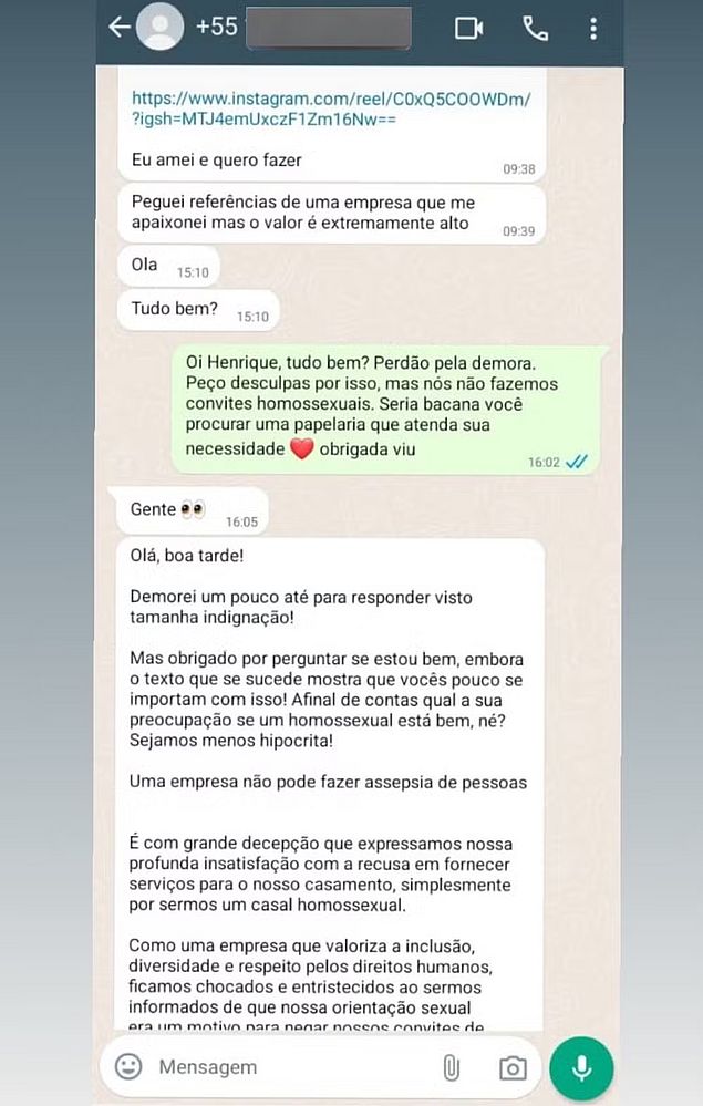 "É com grande decepção que expressamos nossa profunda insatisfação com a recusa em fornecer serviços para o nosso casamento, simplesmente por sermos um casal homossexual. Ficamos chocados e entristecidos ao sermos informados de que nossa orientação sexual era um motivo para negar nossos convites de casamento", escreveu Henrique.