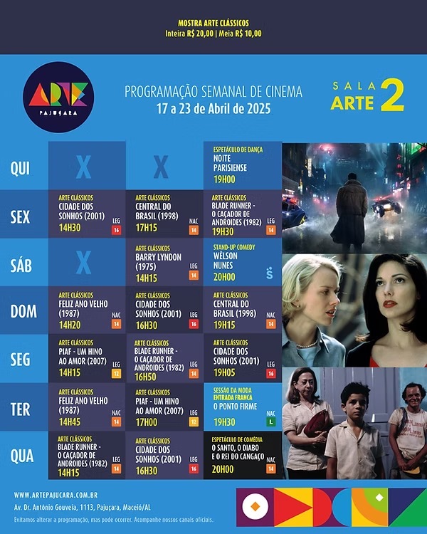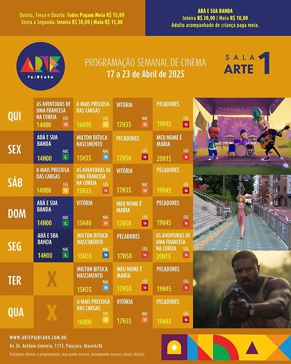 Para conferir a programação completa de todos os filmes em cartaz no Arapiraca Partage Shopping, Centerplex (Shopping Pátio Maceió), Cinesystem (Parque Shopping) e Kinoplex (Maceió Shopping): basta clicar aqui. Já para o Shopping da Vila, em Delmiro Gouveia, pode ser conferida aqui.