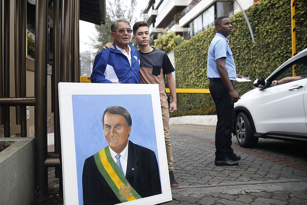 O vendedor de camisas e bandeiras do Brasil, o mineiro André Luiz dos Santos, anuncia greve de fome em protesto pela atual situação do país, na entrada do condomínio do candidato à Presidência da República pelo PSL, Jair Bolsonaro.