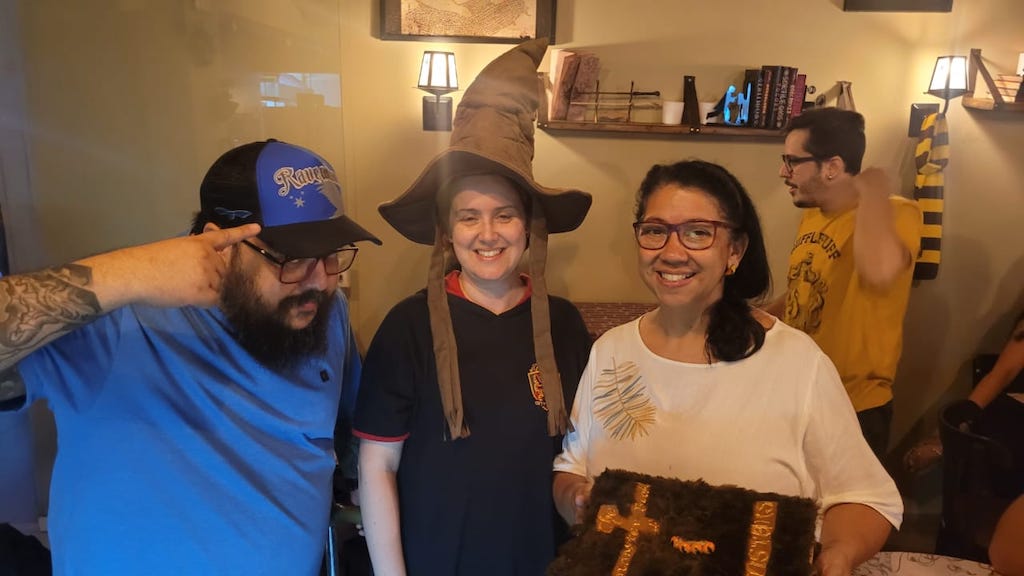 A chef Simone Muniz com os sócios Ana e Carlos, fãs de carteirinha do Harry Potter