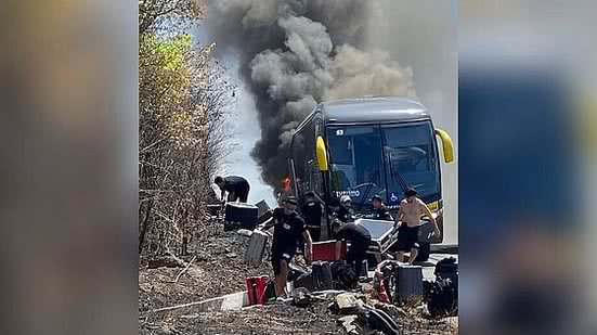 O ônibus com membros da banda do cantor Matheus Fernandes pegou fogo neste domingo (5) em uma rodovia do Ceará, mas ninguém se feriu. O artista não estava no veículo. O acidente aconteceu no início da tarde no município de Jati.