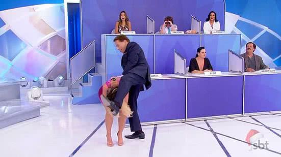 O dono do SBT aproveitou para indagar se a contratava brincava de ‘pular carniça’. Ao ver que a loira não sabia do que se tratava, o empresário pediu para a artista ficar agachada no palco e tentou passar a perna pelo corpo dela, mas não conseguiu e quase a derrubou.