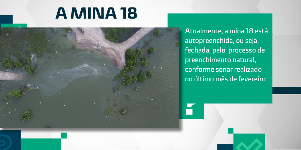 Como está o local hoje? A reportagem apurou que a mina 18, que fazia parte do grupo de cavidades com recomendação técnica para preenchimento com areia, está autopreenchida, ou seja, pelo processo de preenchimento natural, conforme sonar realizado no último mês de fevereiro.
