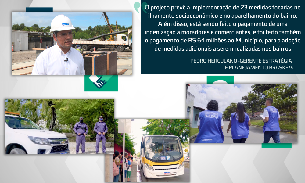 “O projeto prevê a implementação de 23 medidas focadas no ilhamento socioeconômico e no aparelhamento do bairro. Além disso, está sendo feito o pagamento de uma indenização a moradores e comerciantes, e foi feito também o pagamento de R$ 64 milhões ao Município, para a adoção de medidas adicionais a serem realizadas nos bairros”, afirma Pedro Herculano, gerente de Estratégia e Planejamento da Braskem.