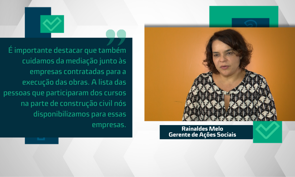 "É importante destacar que também cuidamos da mediação junto às empresas contratadas para a execução das obras. A lista das pessoas que participaram dos cursos na parte de construção civil nós disponibilizamos para essas empresas", afirma Raineldes Melo, Gerente de Ações Sociais da Braskem.
