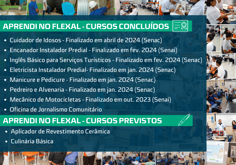 Com 140 vagas ofertadas até o momento, distribuídas por diversos cursos totalmente gratuitos, o programa Aprendi no Flexal promove capacitação e profissionalização, principalmente, para jovens entre 15 e 19 anos de idade. Os alunos são preparados para o mercado de trabalho e também para empreender.