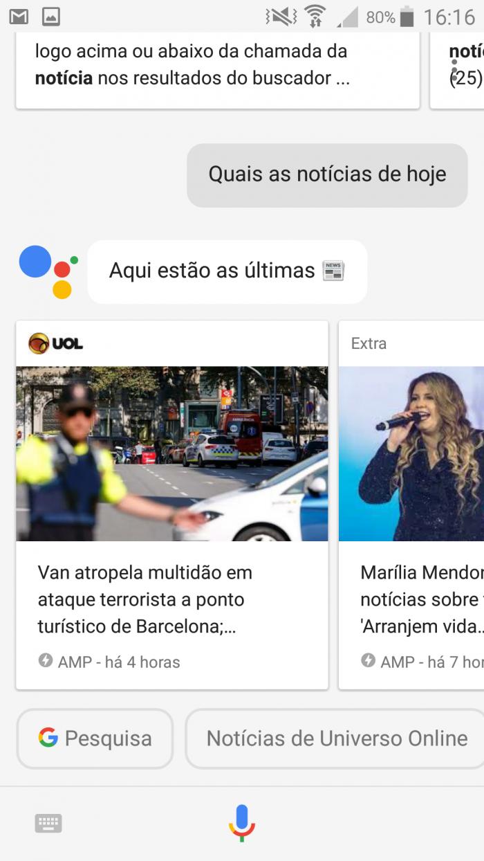 Esse é outro recurso que você consegue acessando o Google Now, mas o Assistente mostra as últimas notícias mais importantes com direito a botões para você ler mais sobre cada veículo que ele cita.