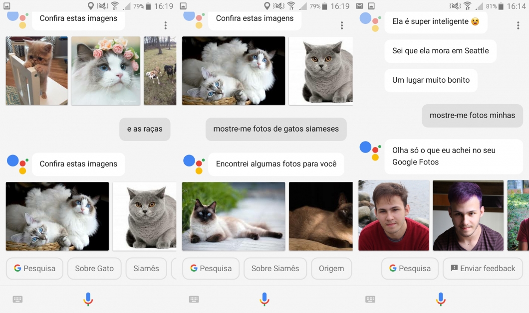 Tá, pode ser mais fácil pesquisar na internet por texto, mas é legal que o Assistente mostre imagens de gatos siameses e tenha abaixo informações sobre a raça, origem e tudo mais. Você também consegue pedir para ele mostrar fotos do seu Google Fotos, como selfies ou fotos que você tirou.
