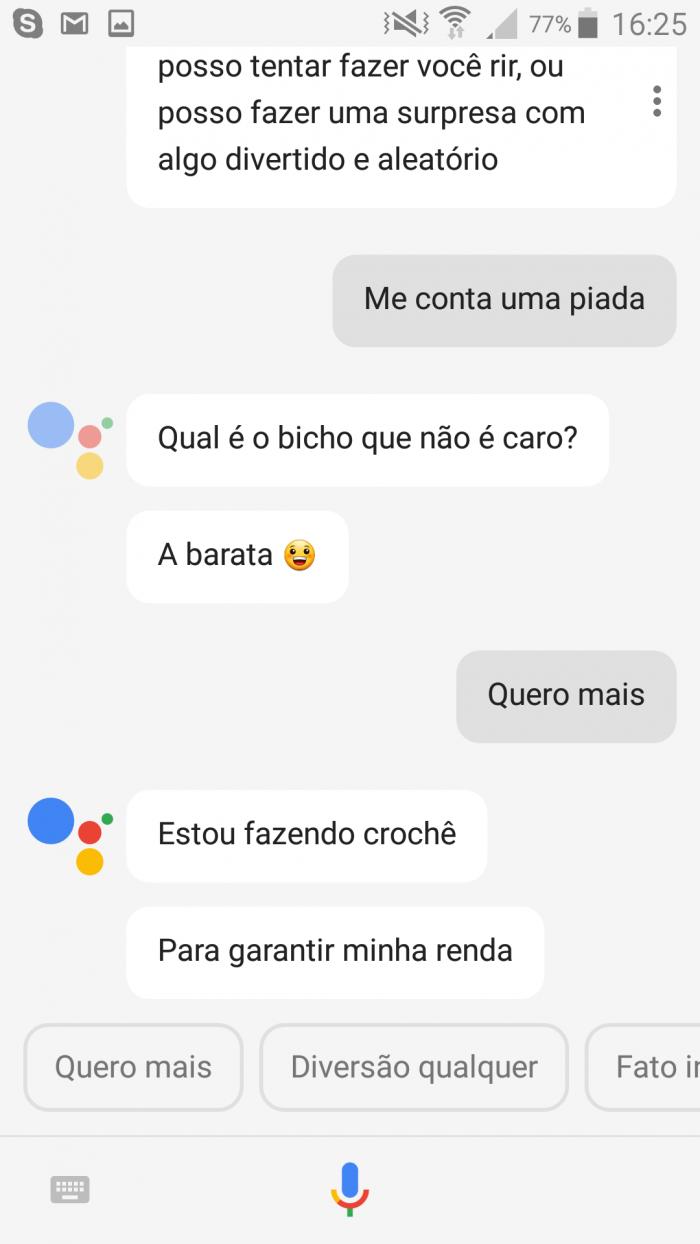 Fora os clássicos recursos de um bom assistente de voz (definir alarmes, lembretes, pedir direções no GPS ou perguntar alguma coisa), o Google Assistente também tem adicionais divertidos, especialmente no nosso idioma. Pode servir para passar o tempo. ¯\_(ツ)_/¯