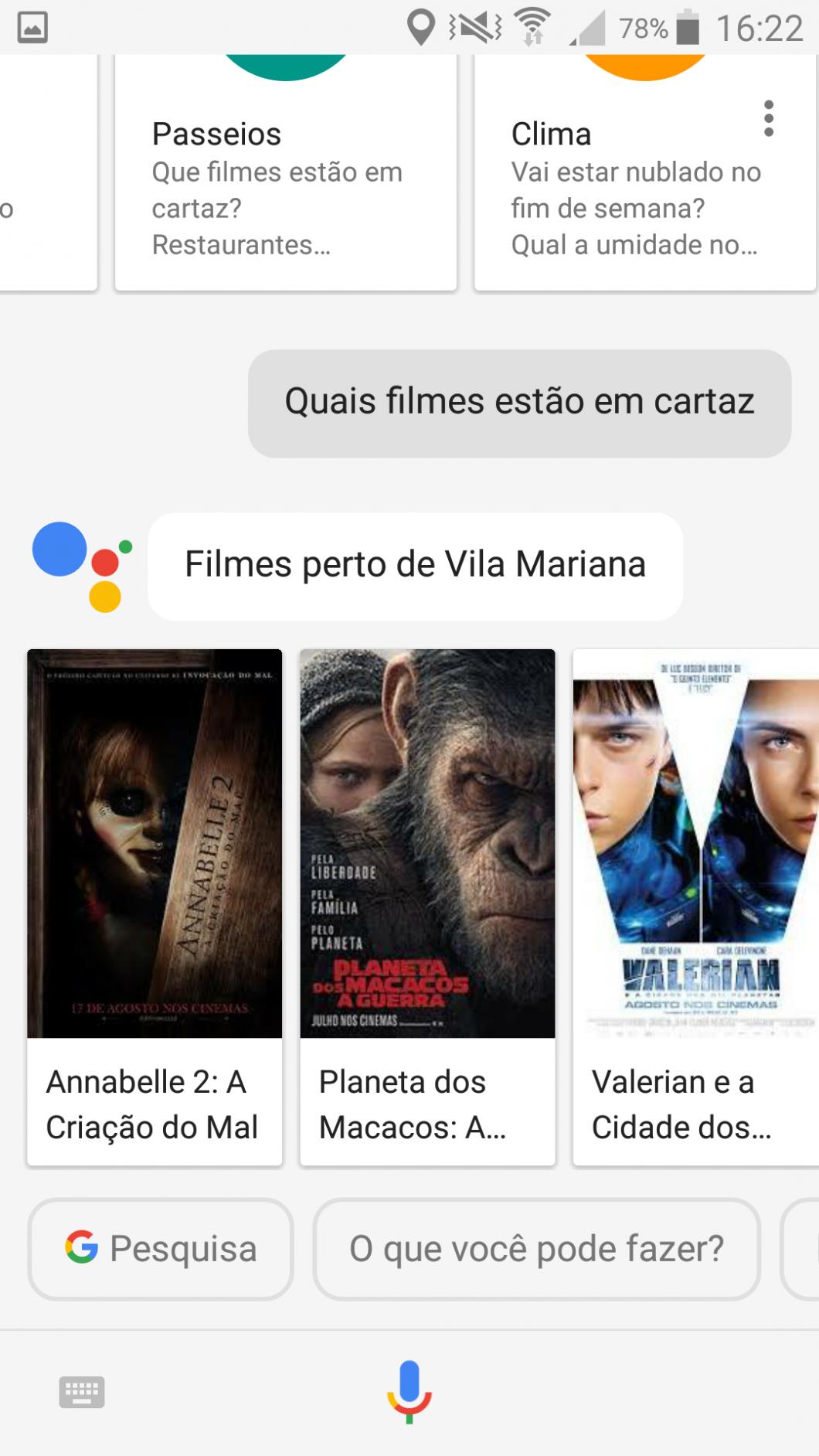 Essa parte mostra o que você pode fazer quando estiver na cidade, como ver os filmes que estão em cartaz no seu bairro, achar restaurantes, bares e até hotéis próximos.