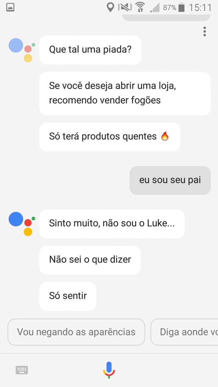 Sim, também tem como você falar a frase icônica de Star Wars para o Assistente: “eu sou seu pai”. Ele vai responder de um jeito engraçado.