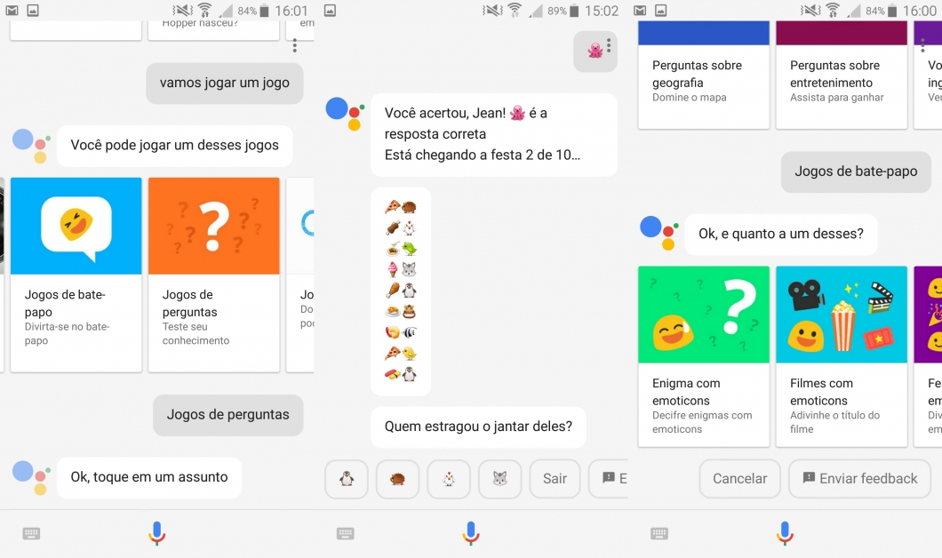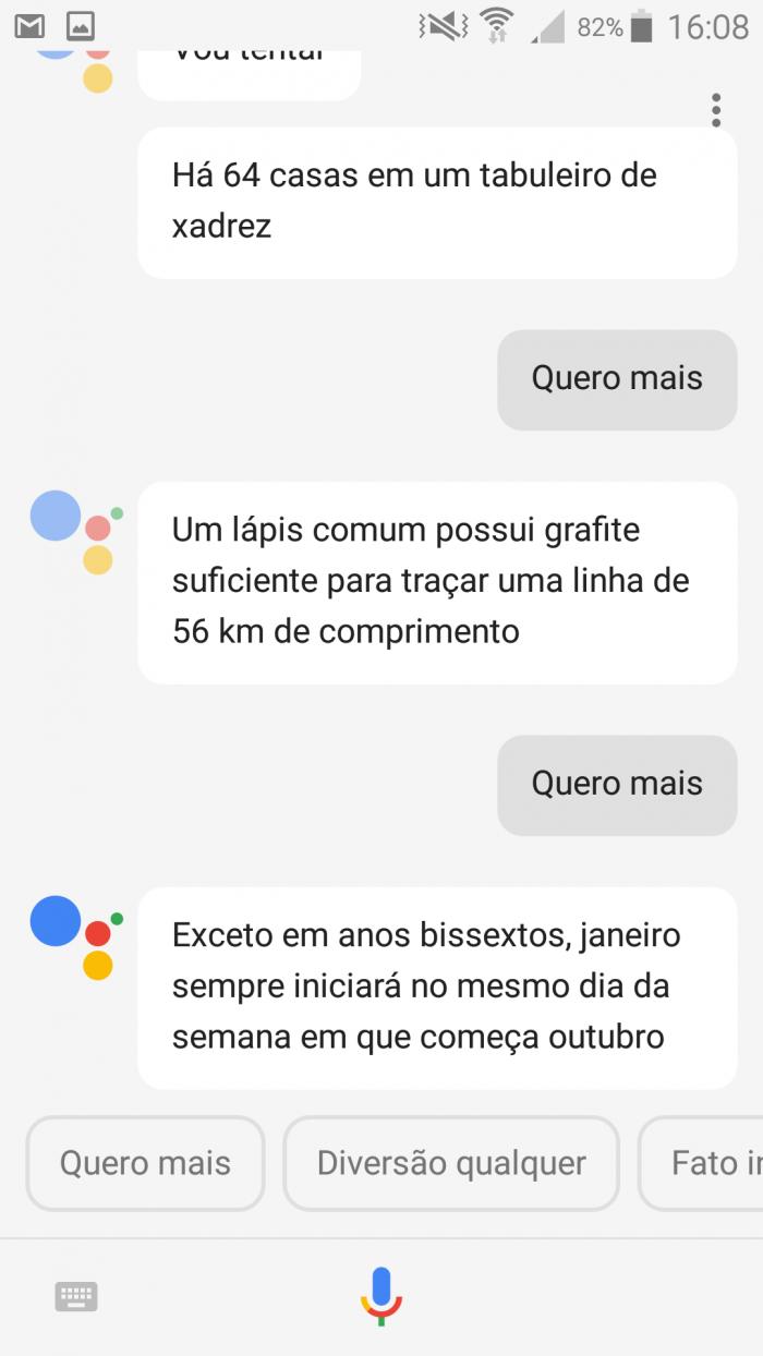 Além de jogos de doodles e jogos clássicos (como jogo da velha e paciência), o Google Assistente oferece jogos de perguntas e jogos de bate-papo. Os de perguntas são feitos para testar o seu conhecimento, de geografia, entretenimento, matemática e de vocabulário no inglês.