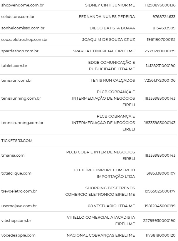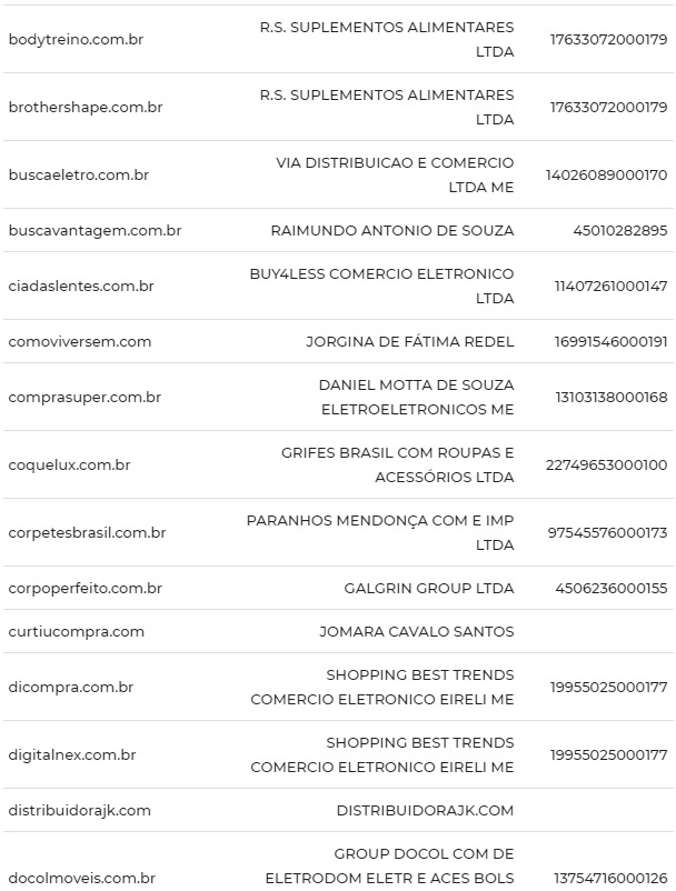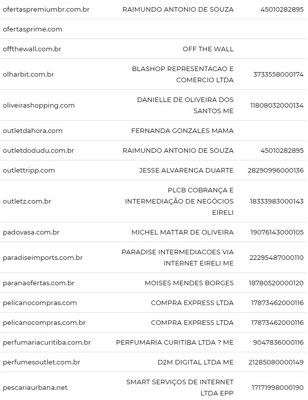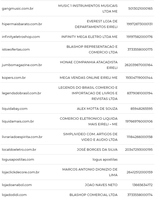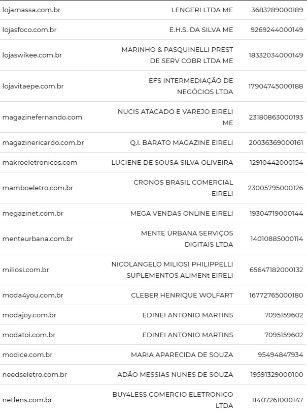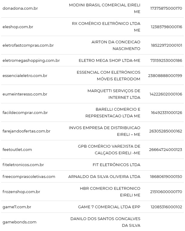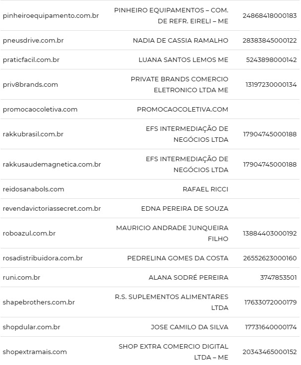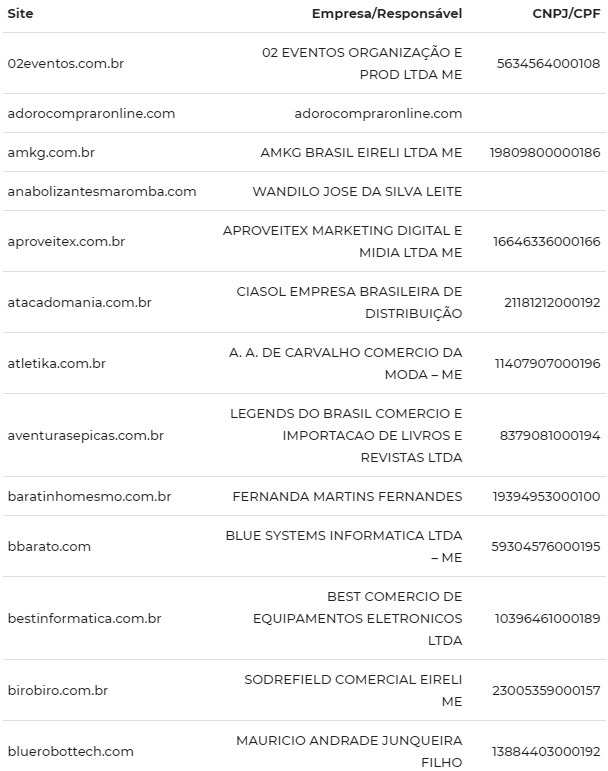A relação inclui a URL da página e outras informações como: nome da empresa, responsável, CNPJ – caso o administrador seja pessoa jurídica – e CPF para pessoa física e a situação. Essa última variável classifica a loja virtual como “Fora do ar” ou “No ar”, em relação à inserção do site na lista.