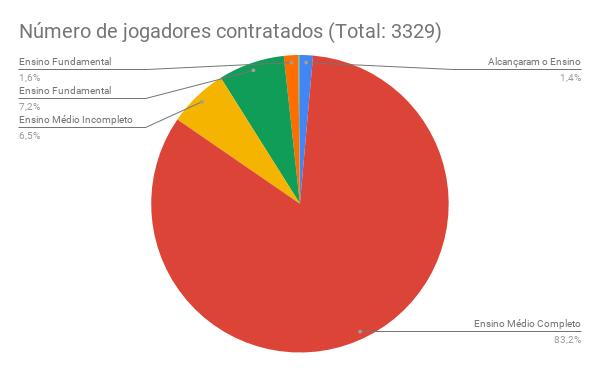 Na contramão do baixo número no Ensino Superior, a quantidade de atletas que possuem o Ensino Médio completo é bem maior que a média brasileira. Dos últimos contratados, 83,3% (2.774 jogadores) declararam terem concluído a Educação Básica (até o Ensino Médio).