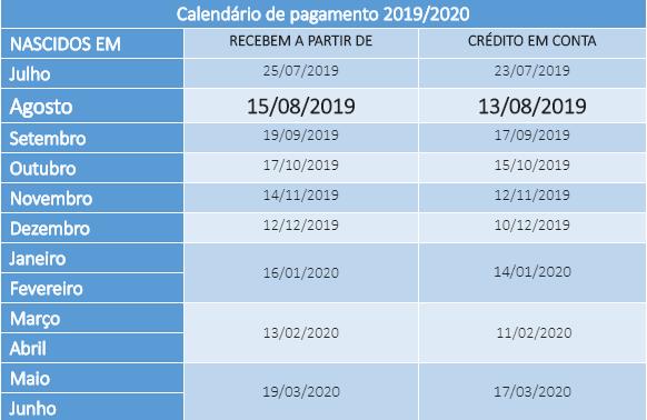 A CAIXA inicia nesta quinta-feira (15) o pagamento do Abono Salarial do calendário 2019/2020 para os beneficiários nascidos em agosto. Os pagamentos são disponibilizados de forma escalonada conforme o mês de nascimento do trabalhador. Os titulares de conta individual na CAIXA com cadastro atualizado e movimentação na conta, recebem o crédito automático antecipado no dia 13/08. Confira: