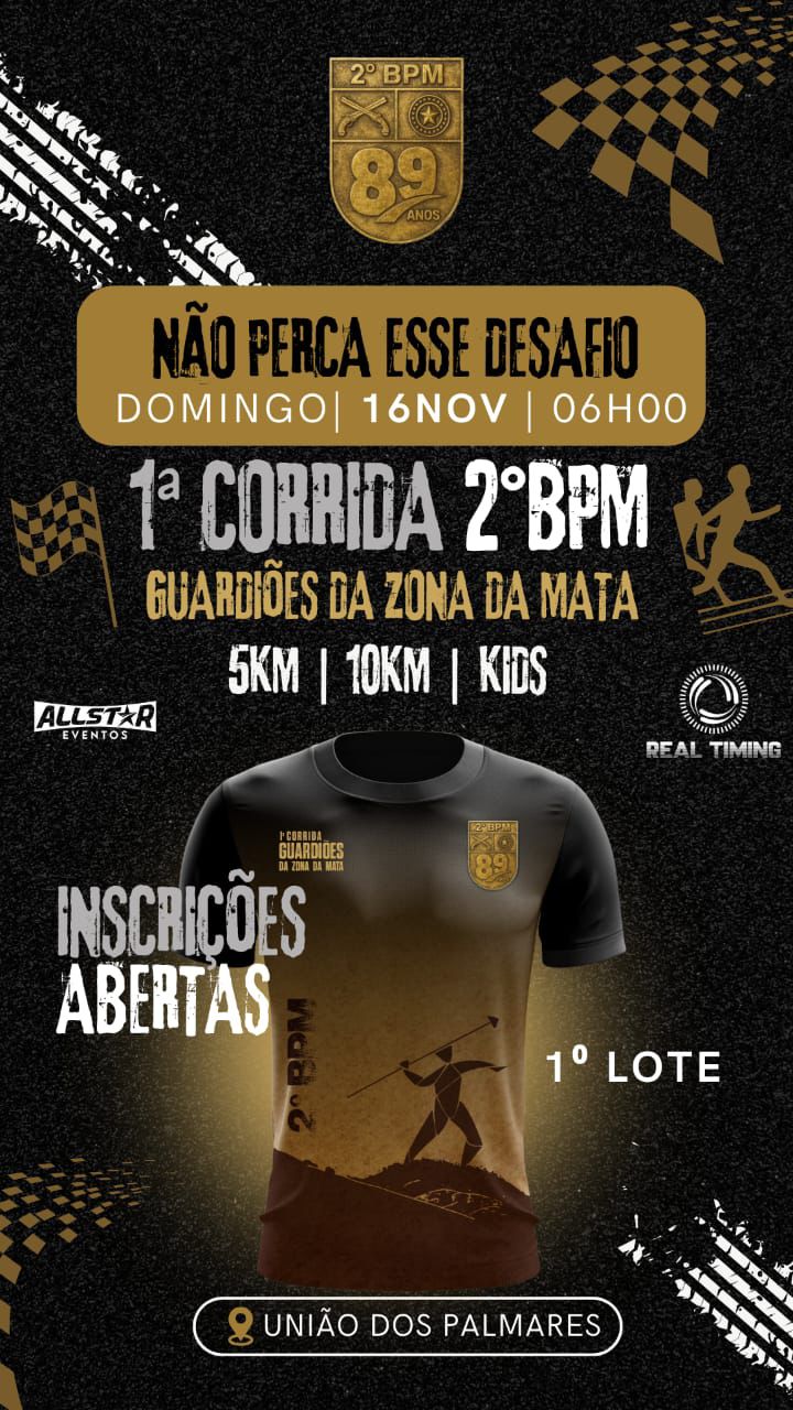 O município de União dos Palmares, na Zona da Mata, será palco de um grande evento esportivo no dia 16 de novembro (domingo), às 6h da manhã. A 1ª Corrida do 2º Batalhão de Polícia Militar (2º BPM), intitulada “Guardiões da Zona da Mata", vai movimentar atletas, militares e a comunidade local em uma manhã de superação e celebração. O 2º BPM tem no comando o Major Glauber Santana, e como sub-comandante, Capitão Vicente.