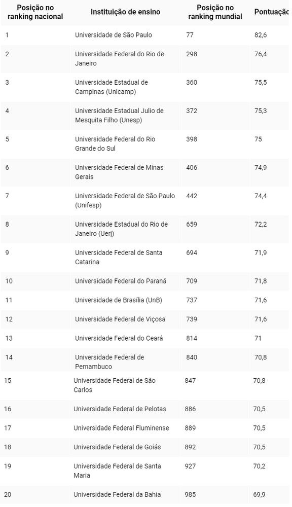 Vinte universidades brasileiras, todas elas públicas, estão na mais recente lista divulgada pelo Center for World University Rankings (CWUR) com as mil melhores instituições de ensino superior do mundo. Das 20, 19 melhoram seus resultados, na comparação com a última edição.