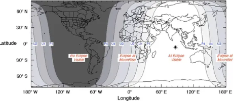 Os tons mais escuros, como está parte do continente americano, indicam os locais em que o eclipse não será visível. Já o cinza mais claro mostra a região onde será difícil observá-lo, visto que o fenômeno acontecerá perto do nascimento da Lua.
