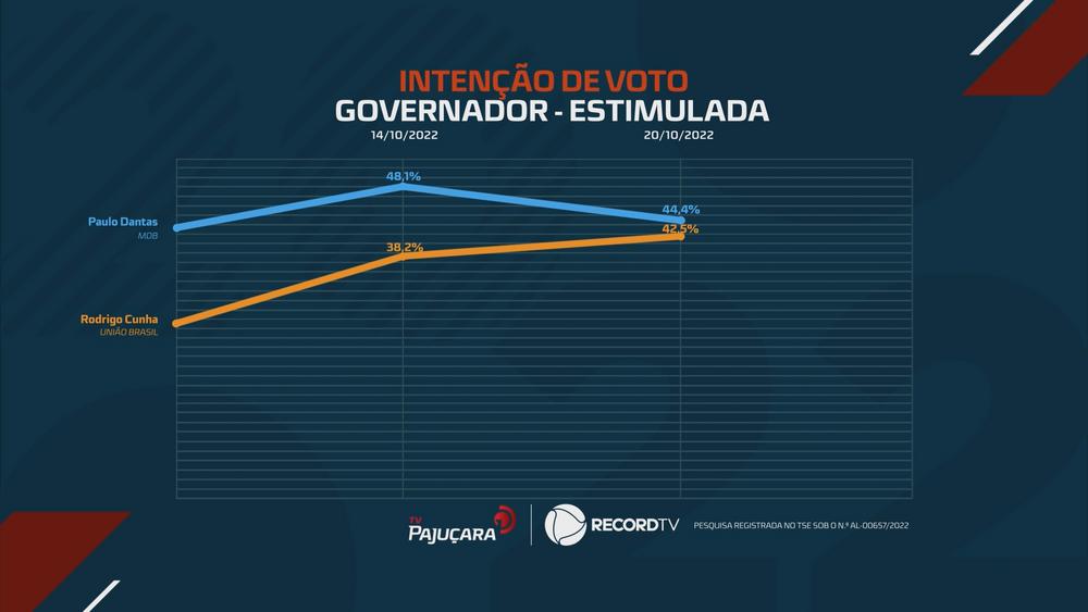 Na pesquisa do ultimo dia 14/10, Paulo Dantas tinha 48,1% das intenções de voto, e agora caiu para 44,4%, numa diferença de 3,7%. Já Rodrigo Cunha, tinha 38,2% na primeira pesquisa e agora subiu para 42,5%, crescendo 4,3%.