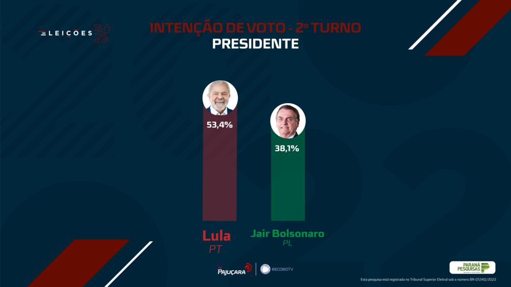 Na disputa pelo Palácio do Planalto, o ex-presidente Luiz Inácio Lula da Silva (PT) lidera as intenções de voto, com diferença de 15,3% para o segundo colocado, Jair Bolsonaro, do PL. Votos bancos e nulos, 4,5%. Não sabe, não respondeu: 3,9%. Veja os números.