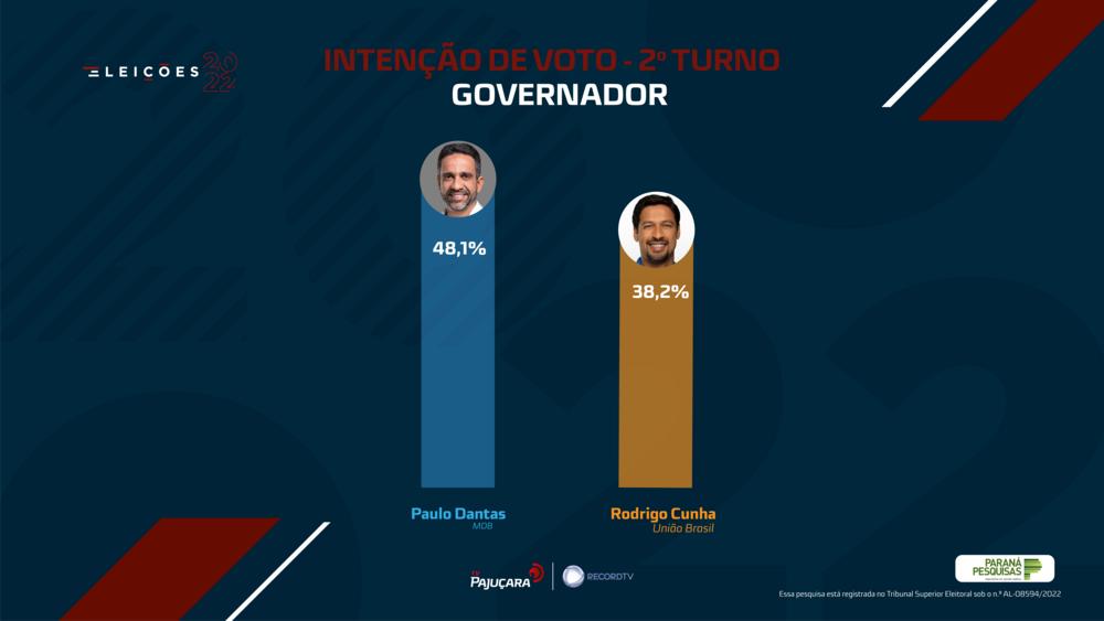 No levantamento para o governo de Alagoas, Paulo Dantas, do MDB, que ficou em 1º na votação do primeiro turno, se matem na liderança, com 9,9% de diferença para o segundo colocado, Rodrigo Cunha, do União Brasil. Votos brancos e Nulos – 7,4%. Não sabe, não respondeu – 6,4% . Veja os números: