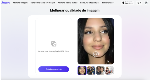 Primeiro da nossa lista está Artguru, um melhorador de imagens que faz um ótimo trabalho aumentando a qualidade de todo tipo de foto. Seja para deixar retratos mais bonitos, fazer fotos de produtos parecerem mais profissionais ou deixar documentos digitalizados mais claros, o melhorador das fotos do Artguru pode melhorar a qualidade na hora. Se você tem fotos borradas que incomodam, Artguru te ajuda a deixá-las mais nítidas. Ele também resolve problemas comuns como aquela aparência granulada e pixelada, deixando as imagens mais limpas e suaves. Uma grande vantagem é sua capacidade de melhorar resolução de imagem, aumentando a qualidade de fotos de baixa resolução para HD, 4K ou até 8K - perfeito para impressões grandes ou para mostrar em telas maiores.