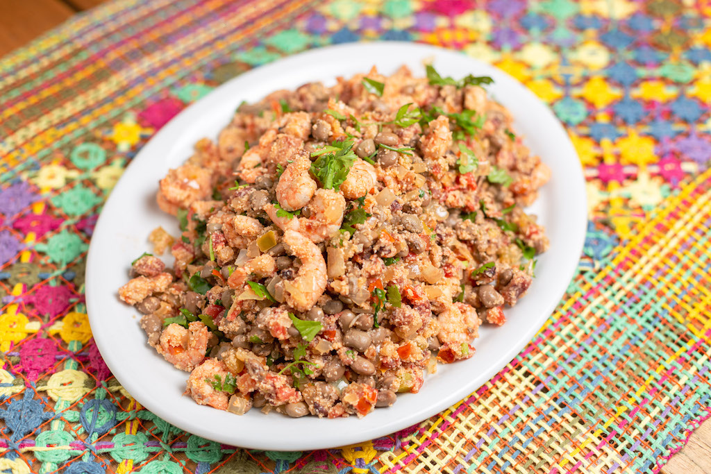 .Arrumadinho de camarão do Cação vem com feijão verde, bacon, farinha e é servido com arroz