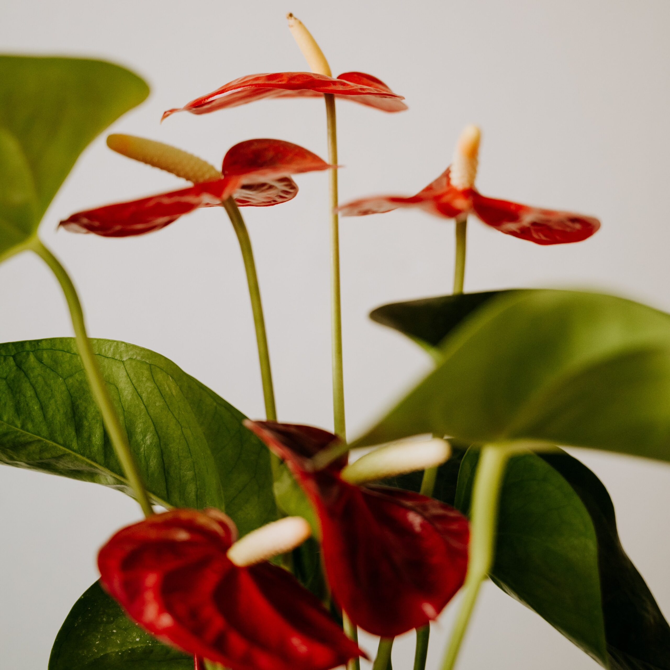 1 – Antúrio (Anthurium): é uma planta tropical com flores chamativas em forma de coração e coloração que varia do vermelho ao verde. Possui uma folhagem brilhante e vistosa. Essas flores gostam de umidade moderada e iluminação indireta.