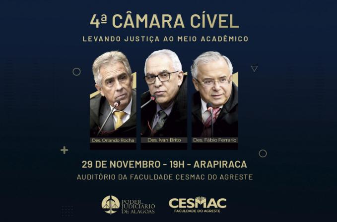 A 4ª Câmara Cível do Tribunal de Justiça de Alagoas (TJAL), por meio do projeto "Levando Justiça ao Meio Acadêmico", realizará uma sessão de julgamentos, nesta quarta-feira (29), às 19h, no Cesmac de Arapiraca. Estão pautados 86 processos entre embargos de declaração, apelações cíveis e conflitos de competência.