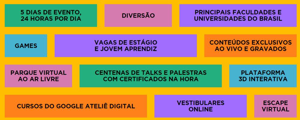 Com estandes online, o evento estará disponível 24 horas por dia entre os dias 9 e 13 de novembro. Os jovens poderão participar de vestibulares online, teste vocacional, dicas para o ENEM, cursos gratuitos do Google Ateliê Digital e Escape Room Virtual. Também será possível emitir certificado de participação no evento em tempo real; possibilidades de recrutamento e seleção, com a oferta de aproximadamente 8 mil vagas de estágio e aprendizagem.