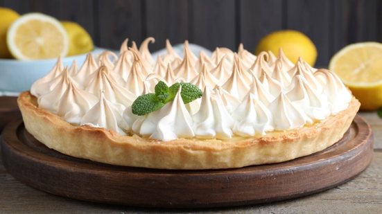 Para o merengue, aqueça as claras com o açúcar em banho-maria, mexendo sempre, até dissolver os grãos (cerca de 65 °C). Bata na batedeira com as gotas de limão até formar picos firmes e brilhantes. Transfira para um saco de confeitar com bico pitanga e decore a torta. Use um maçarico para dourar o merengue ou leve ao forno bem quente por poucos minutos. Finalize com hortelã para decorar.