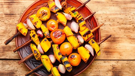 Descasque e corte a abóbora em pedaços. Coloque em uma panela e cubra com água. Leve ao fogo médio para cozinhar até al dente. Reserve. Corte as cebolas ao meio. Em um recipiente, misture a abóbora, as cebolas e os tomates-cerejas. Tempere com sal, pimenta-do-reino, azeite e suco de limão. Mexa bem e leve à geladeira por 2 horas. Após, coloque os vegetais de forma intercalada em palitos de churrasco. Aqueça a grelha em fogo médio e unte com azeite. Frite os espetinhos por 20 minutos, virando-os a cada 5 minutos.