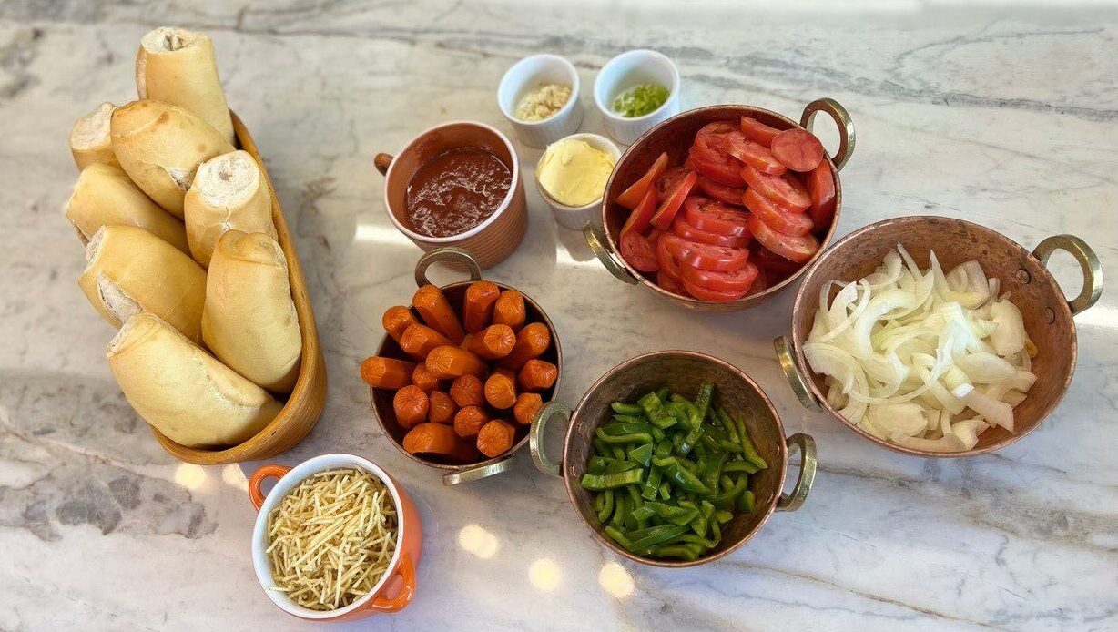 Corte todas os legumes em rodelas e coloque numa panela. Acrescente manteiga, colorau, sal e cominho. Refogue. Em seguida, acrescente o extrato de tomate, e deixe cozinhar. Coloque um pouco de água e deixe cozinhar por aproximadamente 20 min. Em seguida, corte as salsichas ao meio e coloque-as na panela, junto ao molho já grossinho. Deixe cozinhar por mais 5 min. E está pronto! Sirva em pão francês e finalize com batata palha. Delícia!!!