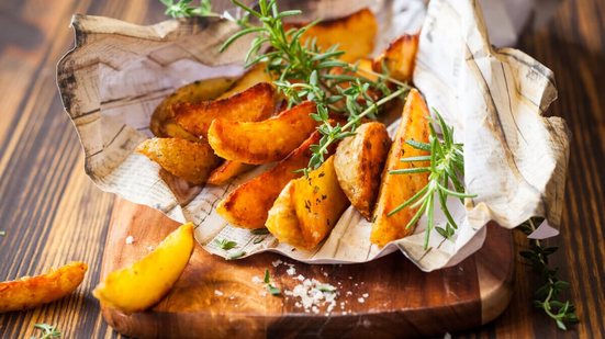 Lave as batatas em água corrente e corte no formato de canoa. Com a ajuda de um pano, seque-as e as disponha sobre uma assadeira com papel-manteiga. Regue com azeite de oliva, tempere com sal, pimenta-do-reino, páprica defumada, alho e orégano. Leve ao forno preaquecido a temperatura média até dourar. Sirva em seguida.