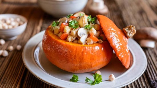 Corte o topo da abóbora e, com o auxílio de uma colher, retire as sementes. Coloque a abóbora em uma forma, regue-a com azeite e leve ao forno médio preaquecido por 25 minutos. Enquanto isso, em um recipiente, misture o grão-de-bico, a quinoa, os cogumelos, a cebola, o pimentão, o sal e a pimenta-do-reino. Retire a abóbora do forno, recheie com a mistura e leve ao forno novamente por mais 7 minutos. Sirva em seguida.
