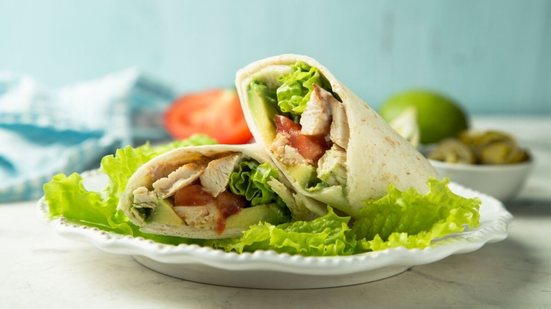 Em um recipiente, coloque o frango e tempere com sal e pimenta-do-reino. Reserve. Em uma panela, coloque o azeite de oliva e leve ao fogo médio para aquecer. Adicione o frango e cozinhe até dourar. Desligue o fogo, fatie e reserve. Nas tortilhas, distribua o abacate, o frango, as folhas de alface e o tomate. Enrole e sirva em seguida.