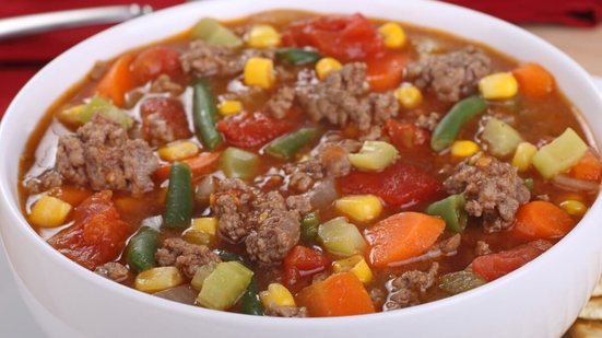 Em uma panela, coloque o azeite e leve ao fogo médio para aquecer. Refogue a cebola e o alho até dourar. Adicione a carne e frite até perder a cor avermelhada e ficar soltinha. Junte o caldo de carne, o tomate, o molho de tomate, o sal e a pimenta-do-reino e cozinhe até levantar fervura. Junte os legumes (chuchus, cenouras, vagem e milho-verde) e cozinhe até ficarem macios. Desligue o fogo e sirva em seguida.