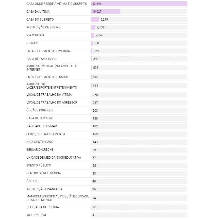 Na sequência, a casa do suspeito aparece como terceiro lugar onde mais as violações aconteceram, com 5.245 casos em toda a região. A instituição de ensino e via pública ficam em 4º e 5º lugar, respectivamente.