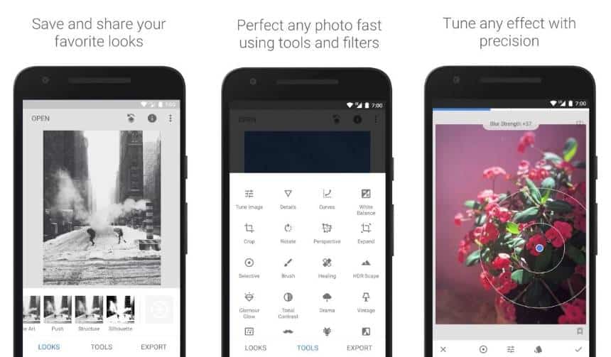 Ele tem todas as características encontradas em um editor de desktops, como desfocar áreas específicas das imagens, ajustar brilho, contraste, balanço de cor e outras ferramentas. Tudo isso é exibido de maneira que mesmo usuários iniciantes consigam aproveitar os recursos, enquanto os mais avançados conseguem resultados incríveis com as ferramentas oferecidas pelo Snapseed.