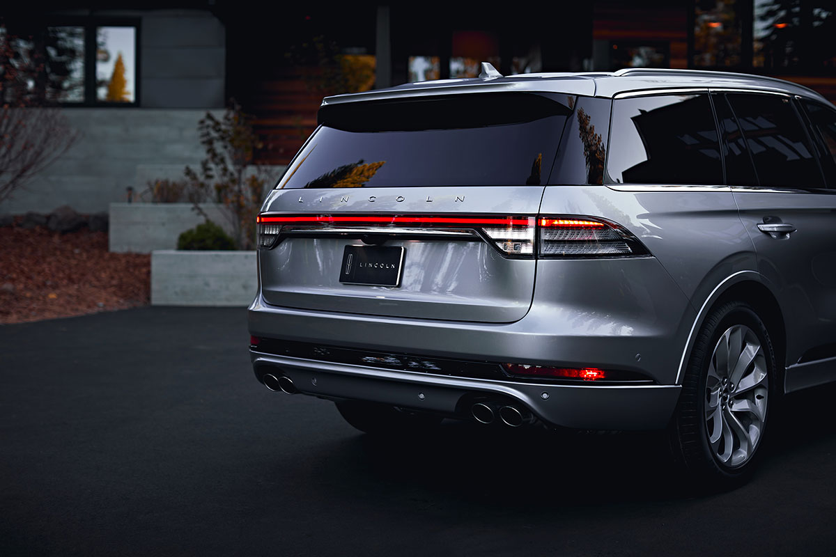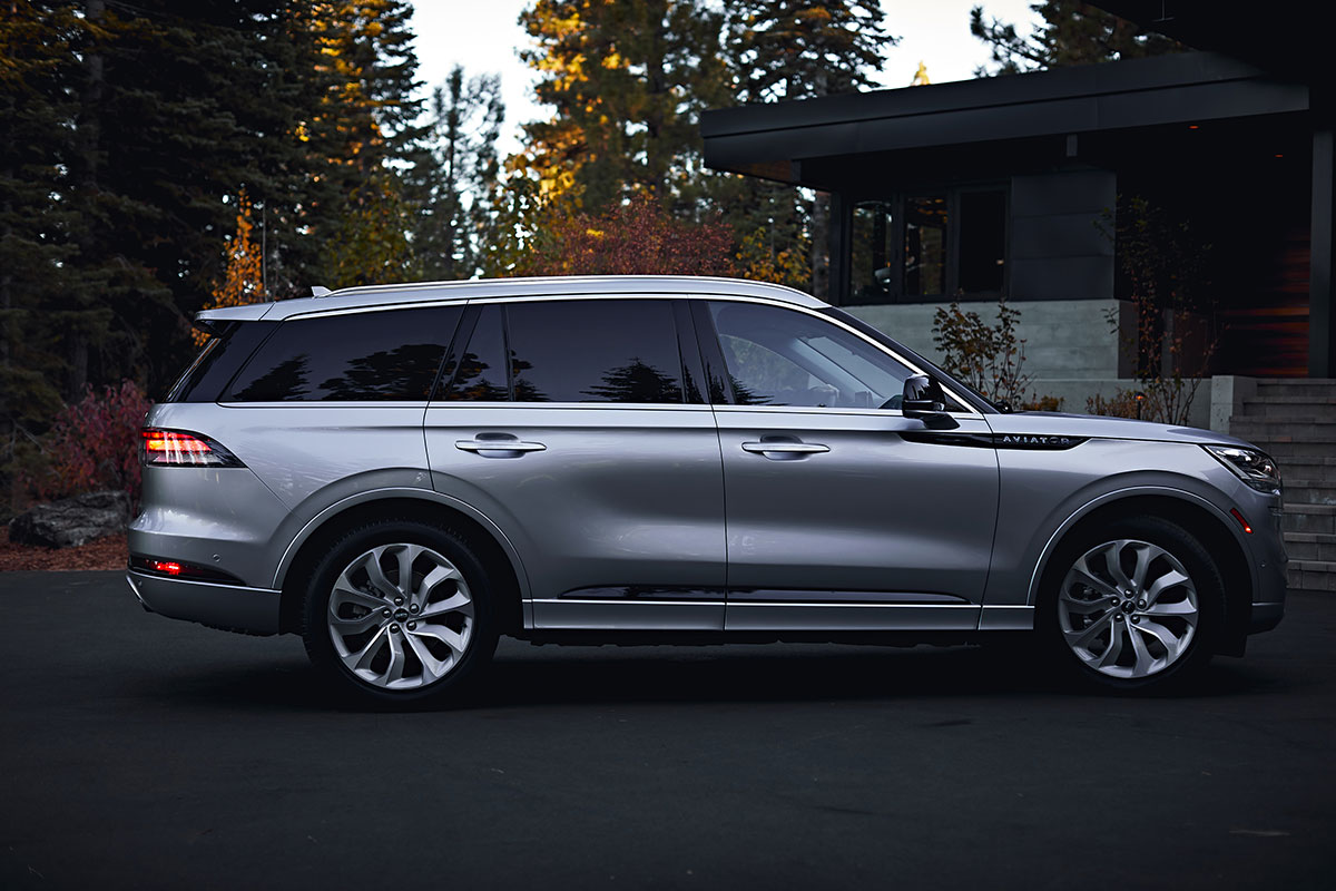 Entre outros refinamentos, o Lincoln Aviator tem um sistema de suspensão que rebaixa automaticamente o veículo para dar boas-vindas ao motorista, junto com a iluminação de assinatura.