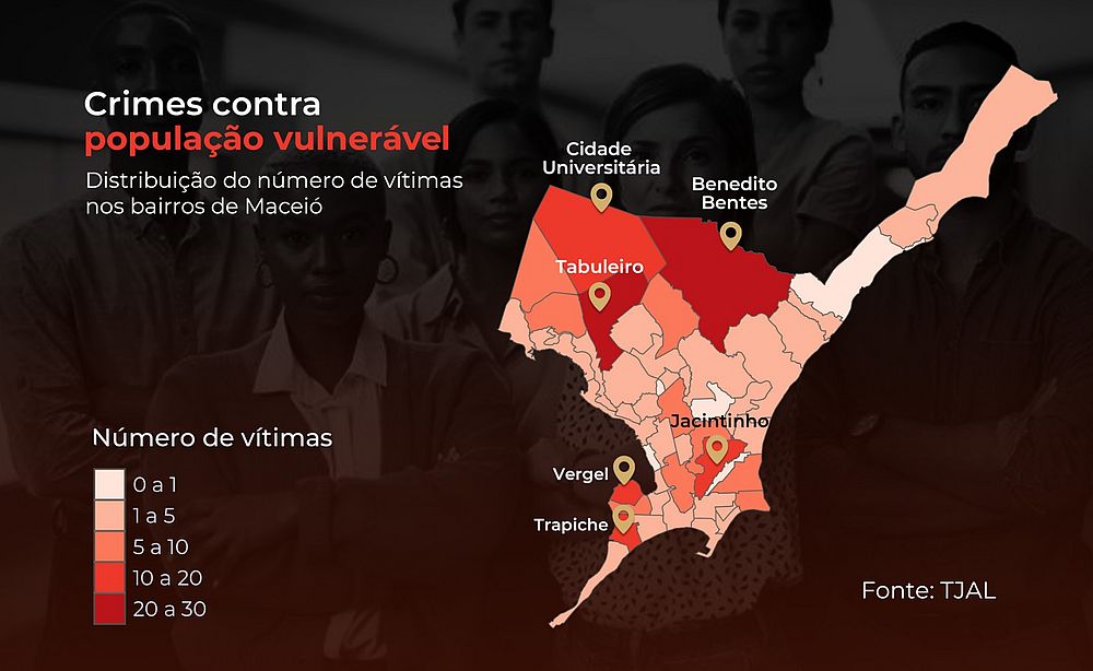 O estudo faz ainda um recorte por bairros de Maceió. No geral, os crimes contra vulneráveis estão concentrados nas regiões menos desenvolvidas economicamente. Chama a atenção, contudo, a maior incidência de crimes contra idosos em bairros com população de renda mais alta.