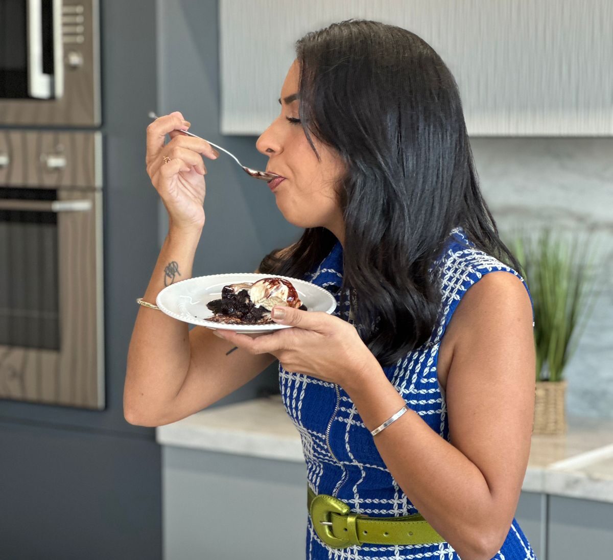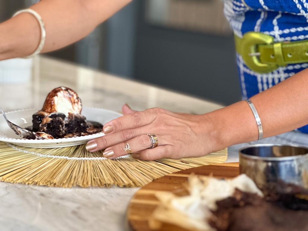 Retire do forno, espere uns 10 min, retire da assadeira e corte como preferir. Coloque num prato de sobremesa, adicione uma bola de sorvete de creme e calda de chocolate de sua preferência. Sirva o bolo ainda quente.