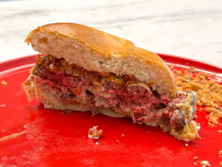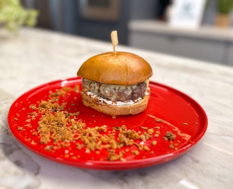 A montagem do hambúrguer é simples, mas tem segredinho: antes de colocar a carne no pão, “forre” a parte de baixo do pão com a maionese defumada, isso impedirá que o pão fique úmido e mole. Pão, maionese, hambúrguer e queijo derretido, crispy de cebola, e farofa de bacon. Finalize com o pão banhando na panela. Fica irresistível!