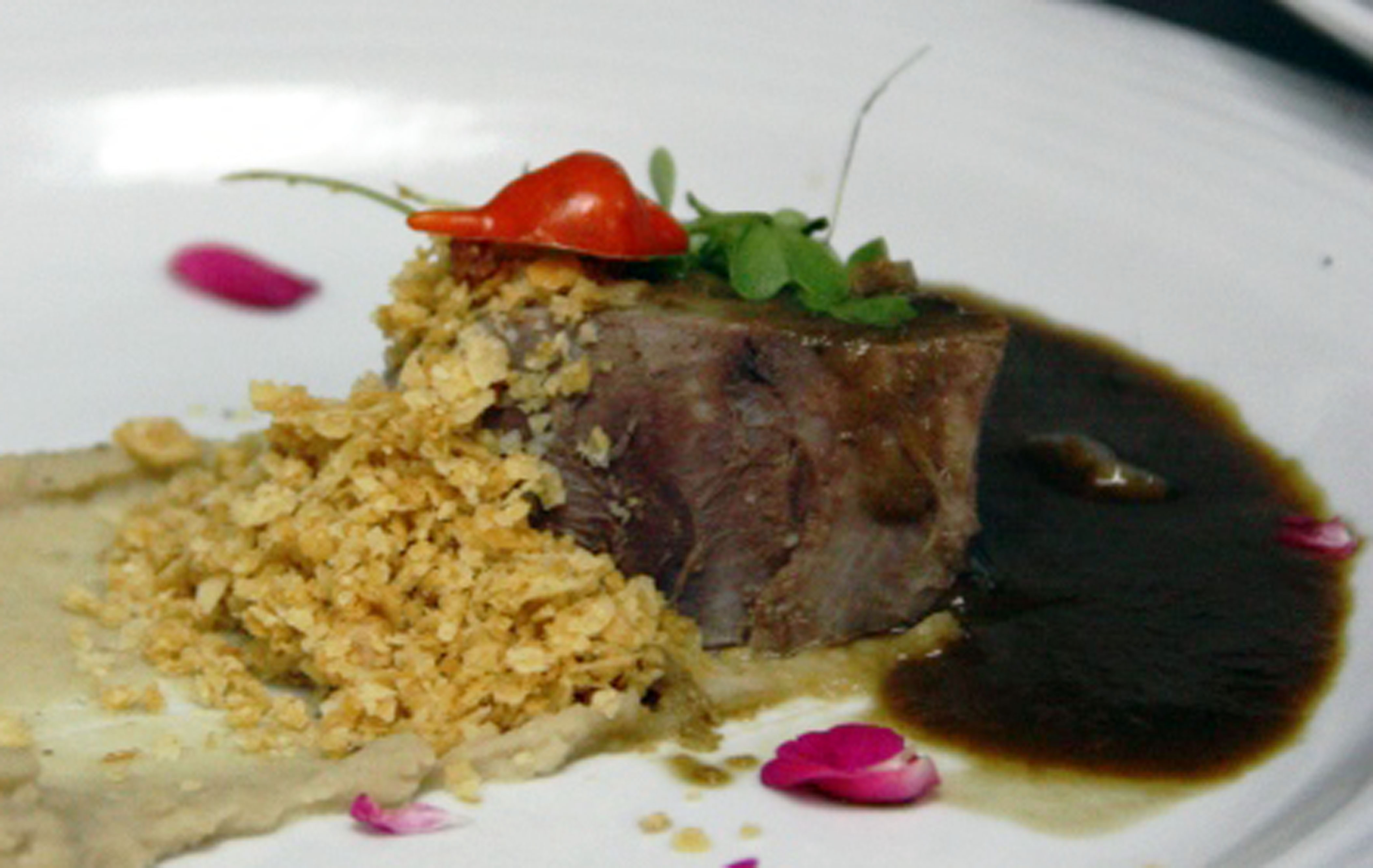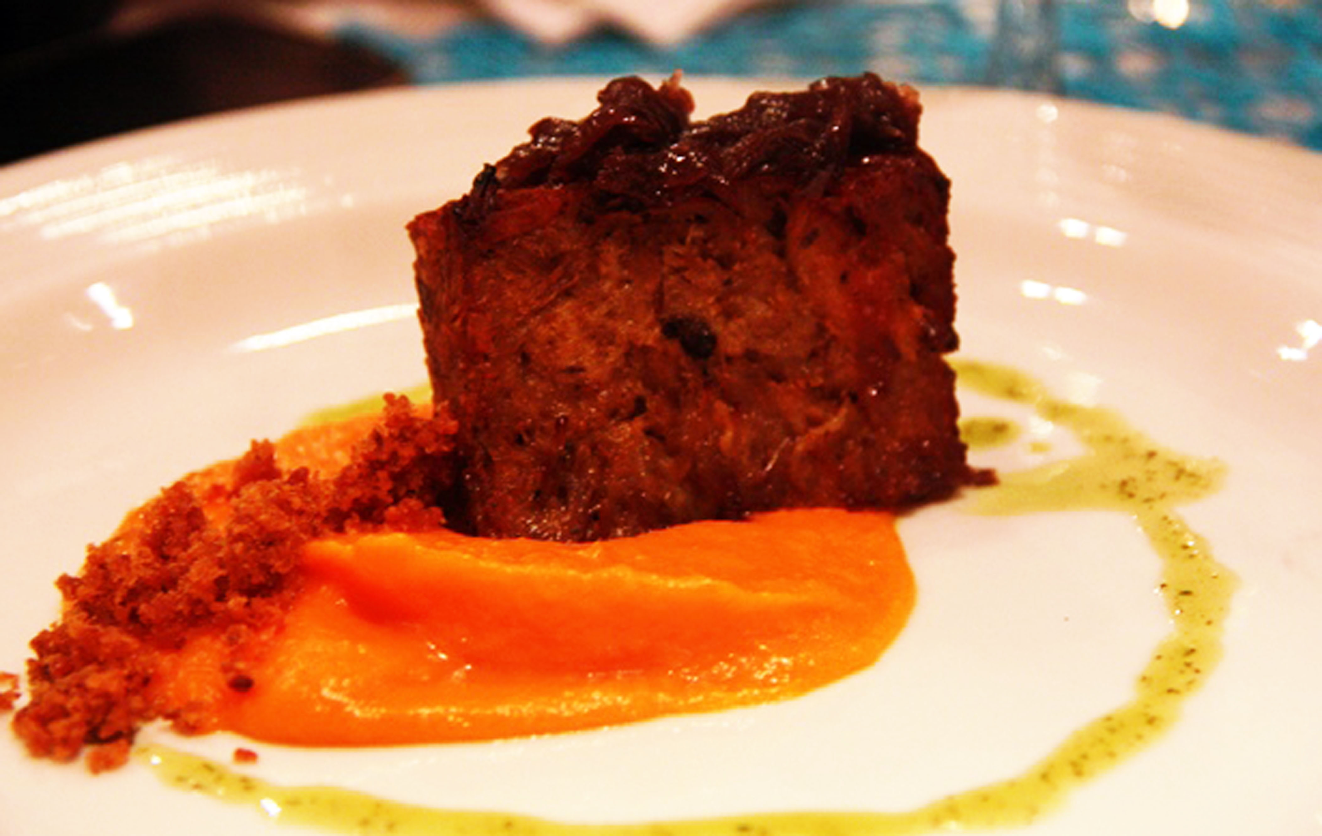 MEL DE ENGENHO – A costelinha de sol suína nem precisou de faca, apenas um garfo; a carne desfiou lindamente… macia e suculenta. Para alegrar os cariocas a iguaria chegou escoltada por purê de jerimum, cebolas carameladas ao vinho e mel de engenho. No comando da receita, o mestre das carnes de sol, chef Wanderson Medeiros (Pucui).